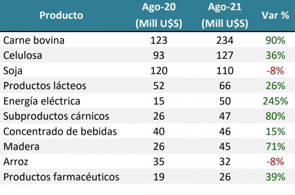 Principales productos exportados durante agosto, según Uruguay XXI