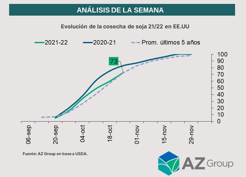 A nivel internacional, la cosecha en Estados Unidos continúa su curso con un 73% del área total recolectada, lo que equivale a un avance intersemanal de 13 p.p. pero 1 p.p. por debajo de lo esperado por los privados. Como se puede observar en el gráfico, en comparación con el año pasado las