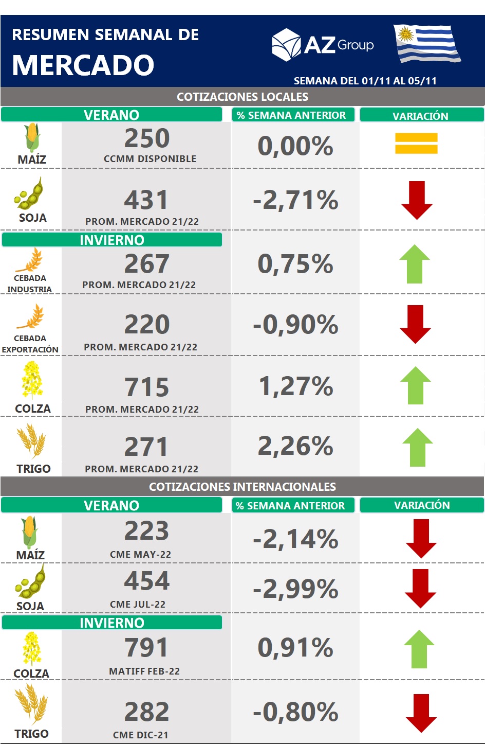En cuanto a la soja, hacia el final de la semana sufrió una baja de 8 US$/t para la posición más cercana. La misma fue consecuencia de toma de ganancias, en conjunto con las perspectivas de que el USDA anuncie un mayor volumen de producción de EE.UU., en el informe mensual