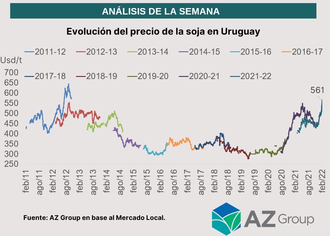 El precio de la soja en el mercado local continúa con una tendencia alcista, durante la última semana estuvo rondando los US$ 570 por tonelada y es el máximo valor precosecha alcanzado desde el año 2012.