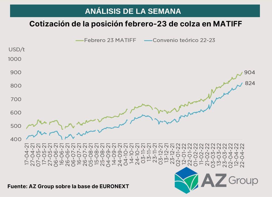 En la jornada de hoy, la posición feb-23 de colza en MATIFF alcanzó los US$ 904 por tonelada, valor máximo desde que empezó a cotizar.