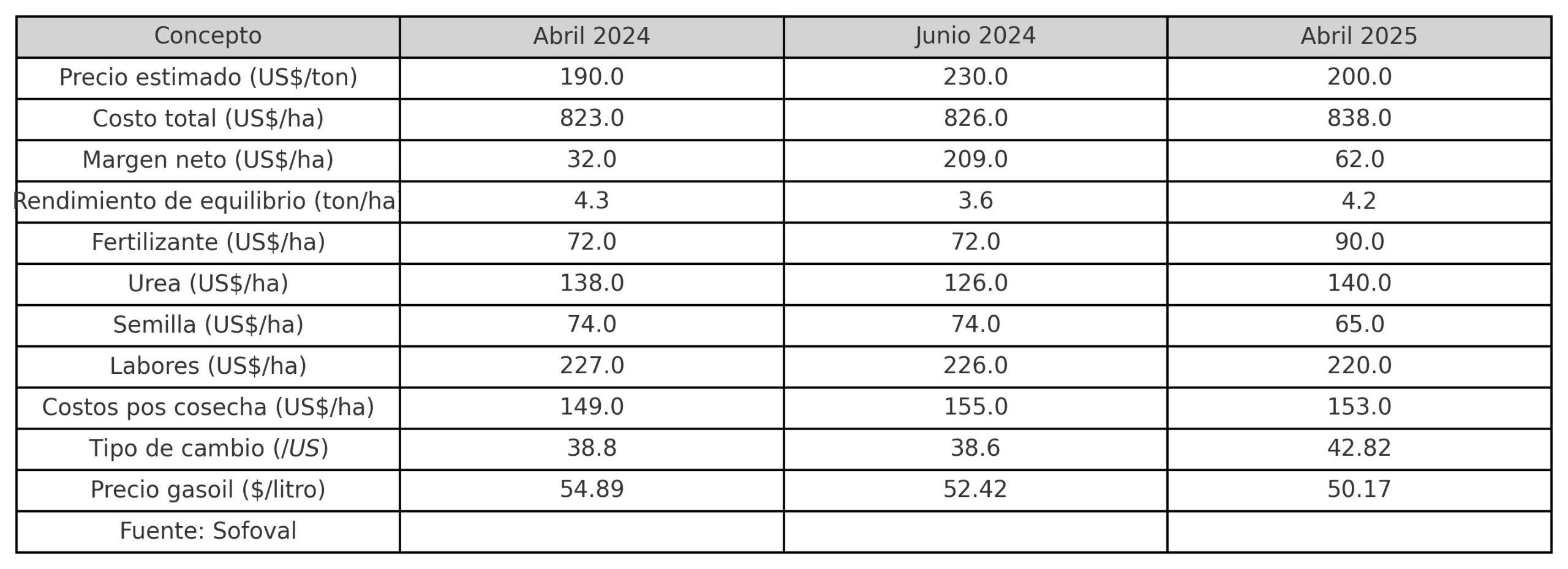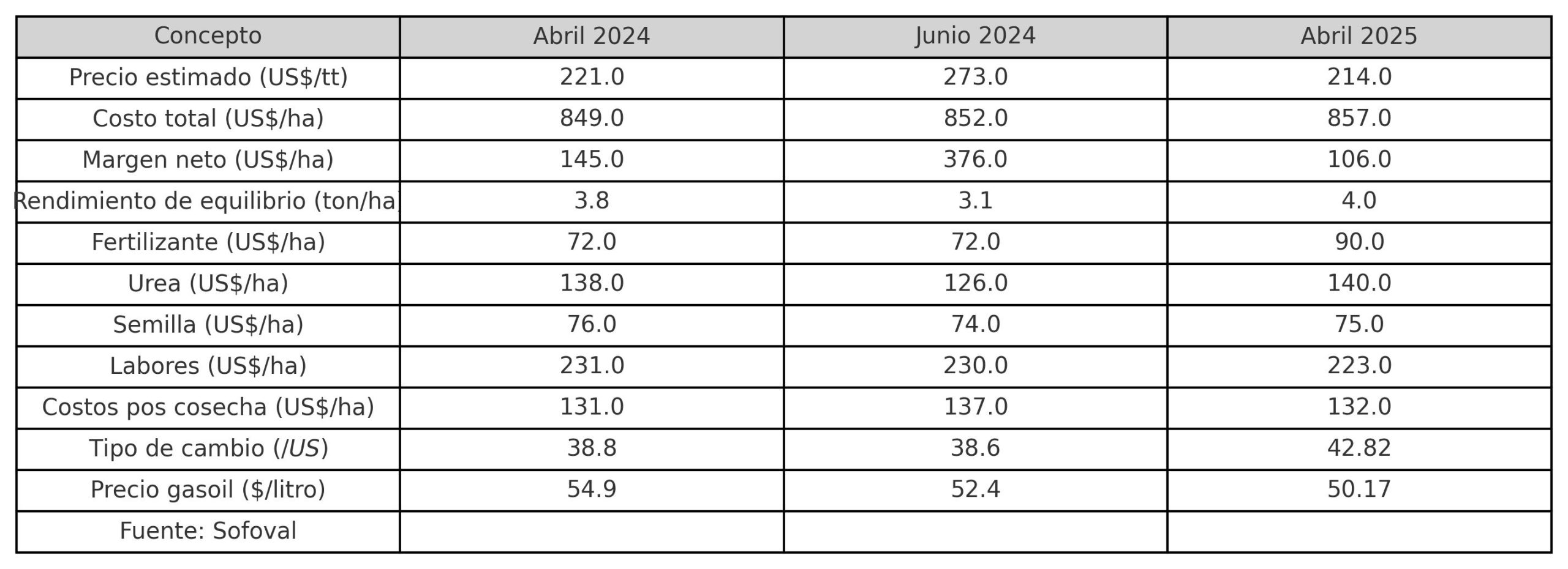 En comparación con la Guía de Costos de junio de 2024, el informe de abril 2025 muestra un escenario con menores precios y márgenes más ajustados. En junio del año pasado, Sofoval estimaba un costo total de US$ 852 por ha, un precio de venta de US$ 273 por tonelada, y un margen neto de US$ 376 por ha, con un rendimiento de equilibrio de 3.100 kg/ha, sensiblemente menor al actual.