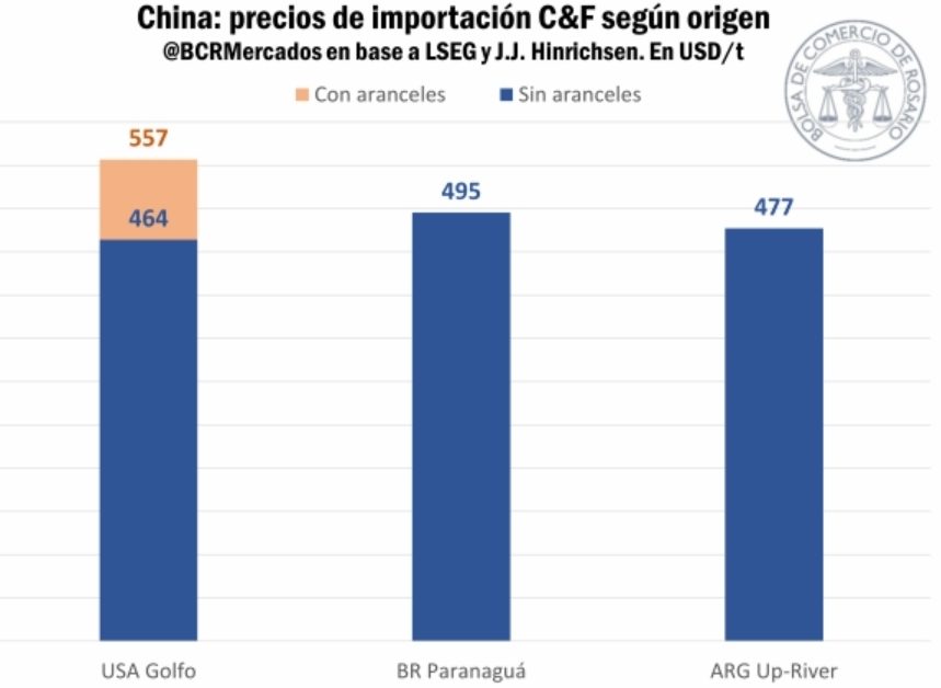 Actualmente, la soja estadounidense enfrenta un arancel del 20% más que el resto de los orígenes, lo que le hace perder competitividad frente a la oferta sudamericana, aun cuando el FOB estadounidense esté en niveles muy bajos para la nueva cosecha.