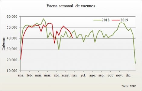 La faena de vacunos en la semana al 15 de junio confirmó la tendencia a la baja que venía registrando desde hace unas semanas atrás y apenas logró sostenerse por encima de las 40 mil cabezas.