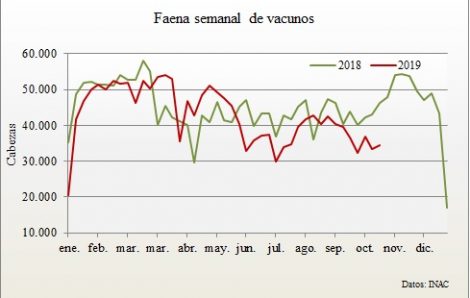La actividad industrial con vacunos en la semana al 26 de octubre, de acuerdo a los datos que proporciona INAC fue de 34.563, unas 1.100 reses más que una semana antes (+3,5%).